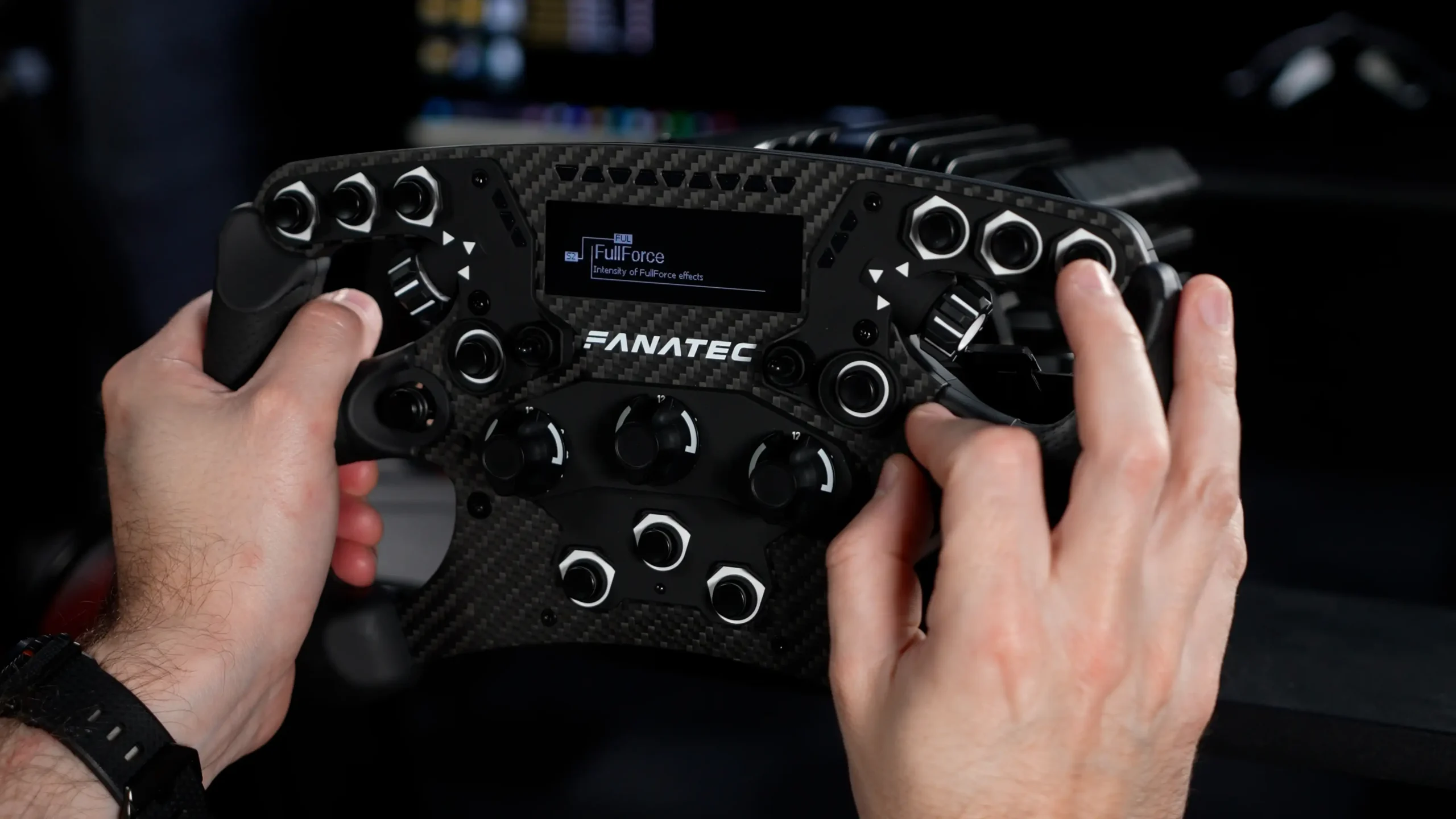 The most obvious change is the move to a larger 2.7-inch OLED display, the same screen used in the DD1, DD2, and Podium Button Module Endurance. This is a meaningful improvement over the tiny screen Fanatec has stuck with for so long. It still is not the SimHub-compatible colour display many people have been asking for, but it does make the tuning menus easier to use and gives you access to much more data while driving.