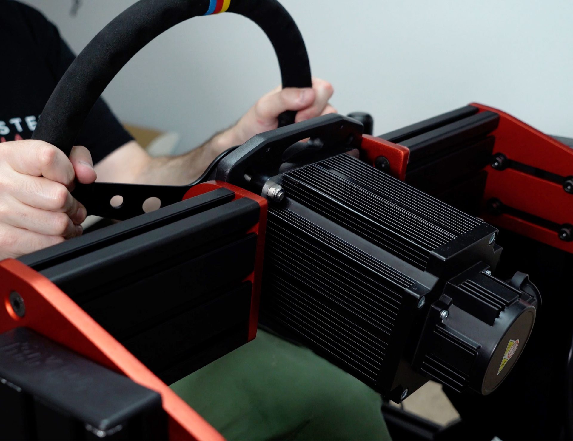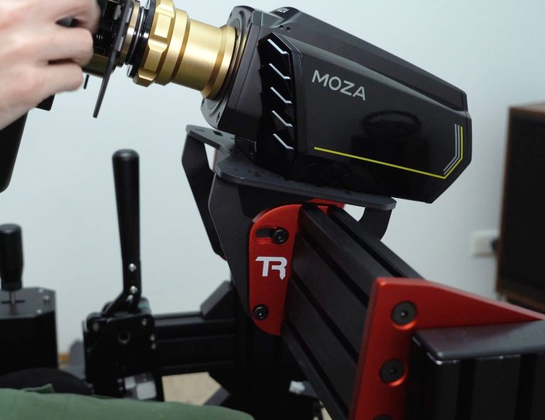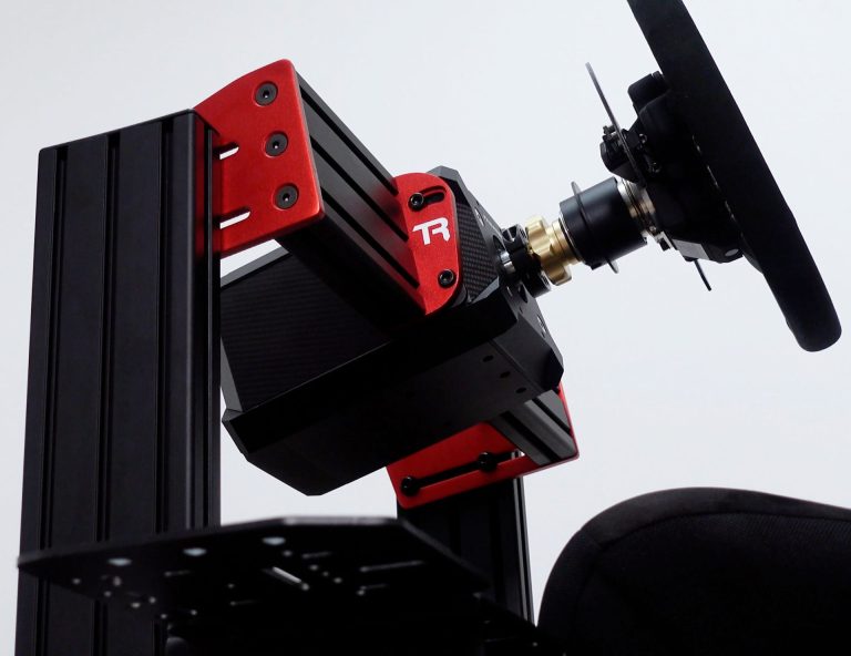 First, we have the “TR-One Fully Adjustable DIrect Fit Wheel Mount for Fanatec Podium DD1 DD2 CSL DD”. We were happy with this wheel mount when put through its paces with a Fanatec DD2. Installation is simple and achievable with 1 person (but easier with 2). We found there to be plenty of adjustability for our needs and it was very rigid, with very minimal flex (watch our full review video to see our flex tests and driving tests.
